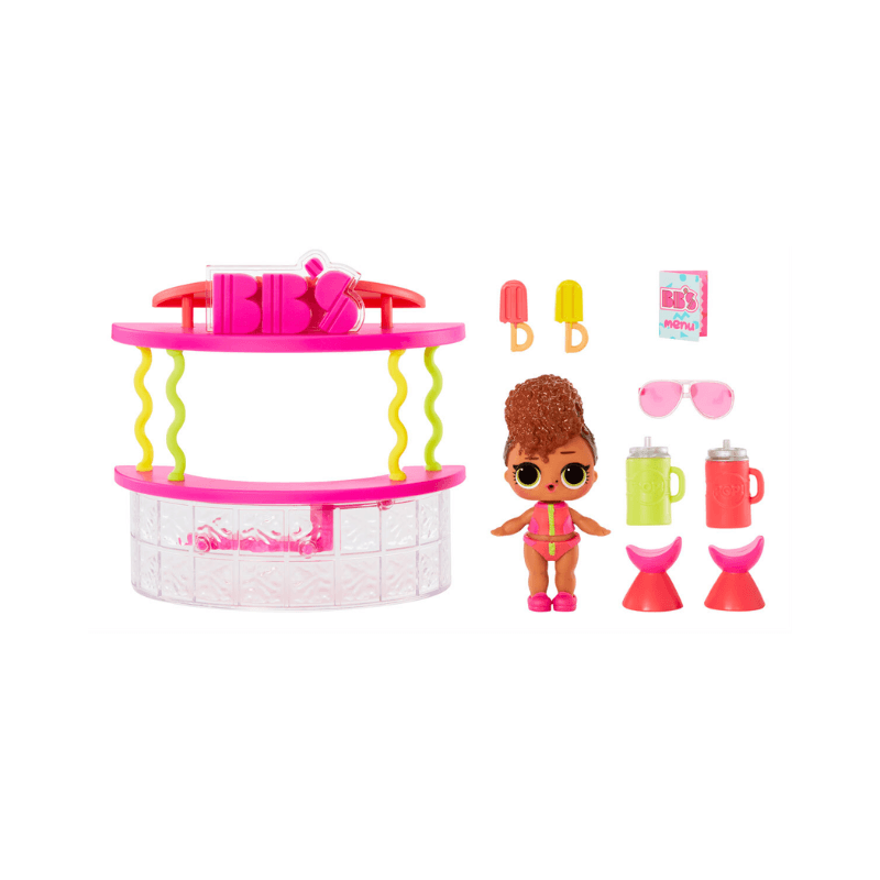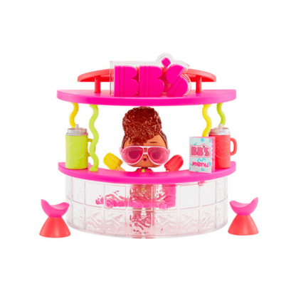 Get ready to be amazed by the L.O.L. Surprise Smoothie Bar Furniture Playset and Rip Tide Doll, featuring 8 surprises and an exclusive doll! Meet Rip Tide, who is hanging out with her B.B.s at the trendy and new snack bar. This playset is a perfect addition to the L.O.L. Surprise dollhouse, fitting perfectly next to the diner. With each playset comes an exclusive doll, a fabulous snack bar, 2 modern stools, 2 popsicles, a fashion outfit, and a bottle. Don't miss out on collecting all 4 new L.O.L. Surprise Playsets and creating a world of play with the L.O.L. Surprise Outrageous Millenial Girls House of Surprises dollhouse.