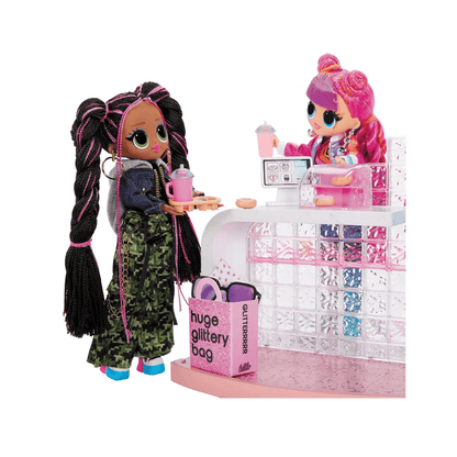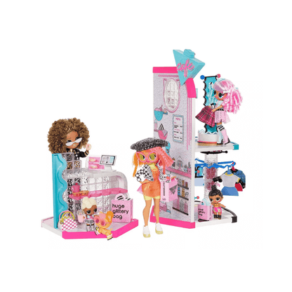 Explore the amazing LOL Surprise! OMG Mall Of Surprises and discover a two-storey B.B. Boutique filled with spinning clothing rack displays, showcasing fierce fashion and accessories. Don't miss the Café hangout, complete with a two-sided counter perfect for ordering and serving delicious doughnuts and cute drinks..