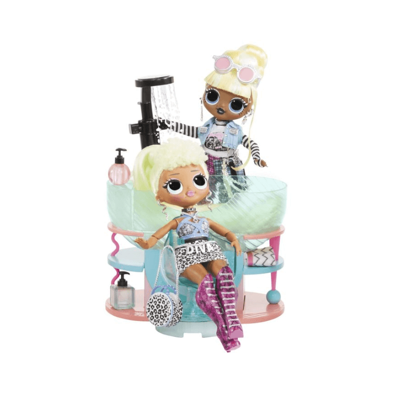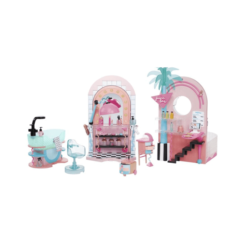 Experience the amazing spa that caters to both O.M.G. fashion dolls and collectible dolls, complete with a working waterfall. Bring your favorite color-changing doll to witness their incredible transformation in real-time. And don't worry about a bad hair day - just head to the salon equipped with various hair styling accessories and an adjustable chair. Get ready to wash your doll's hair at the working hair washing station and admire your new look in the light-up mirror! End your luxurious spa day with a visit to the nail salon and juice bar, where you can enjoy a mani/pedi and some delicious avocado toast and celery juice. Complete your doll's world-of-play by pairing this with the L.O.L. Surprise! Mall of Surprises and O.M.G. House of Surprises Dollhouse.