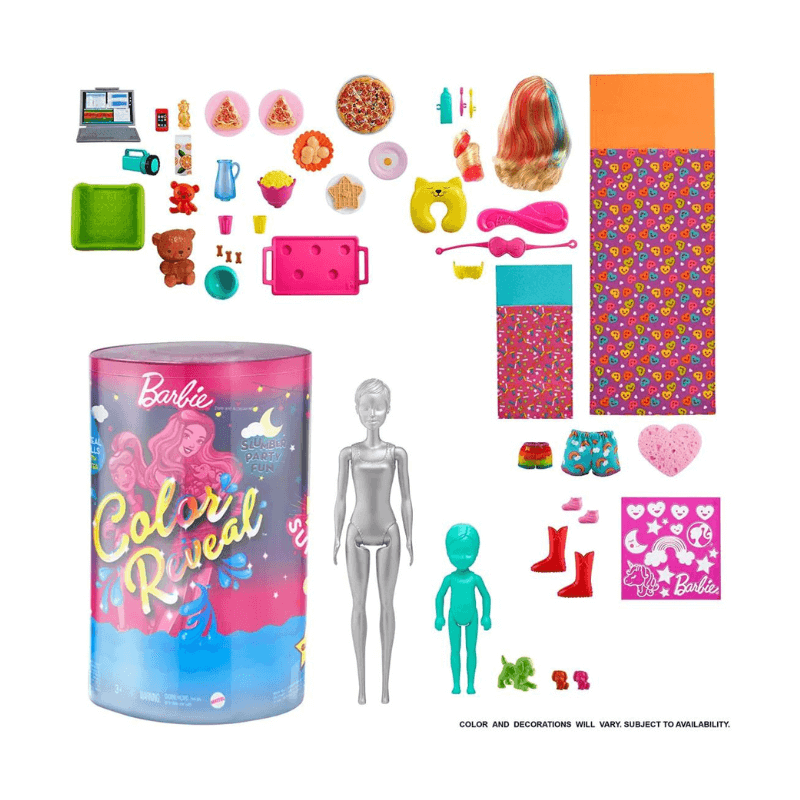 Who doesn't love a good sleepover? Now, you can join Barbie and her crew at the ultimate slumber party with the Mattel Barbie Colour Reveal Slumber Party Dolls & 50 Accessories Pack!
