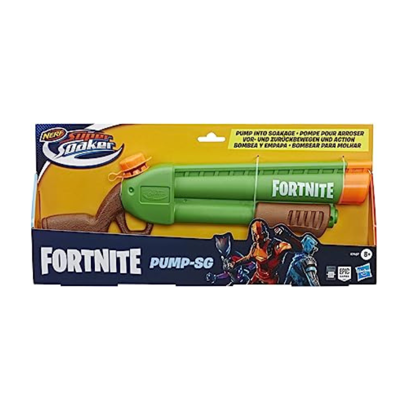 The Fortnite Pump-SG water blaster is inspired by the blaster used in Fortnite, replicating the look of the one from the popular video game! Take your Fortnite battles into real life and soak up the fun with pump-action water blasting.