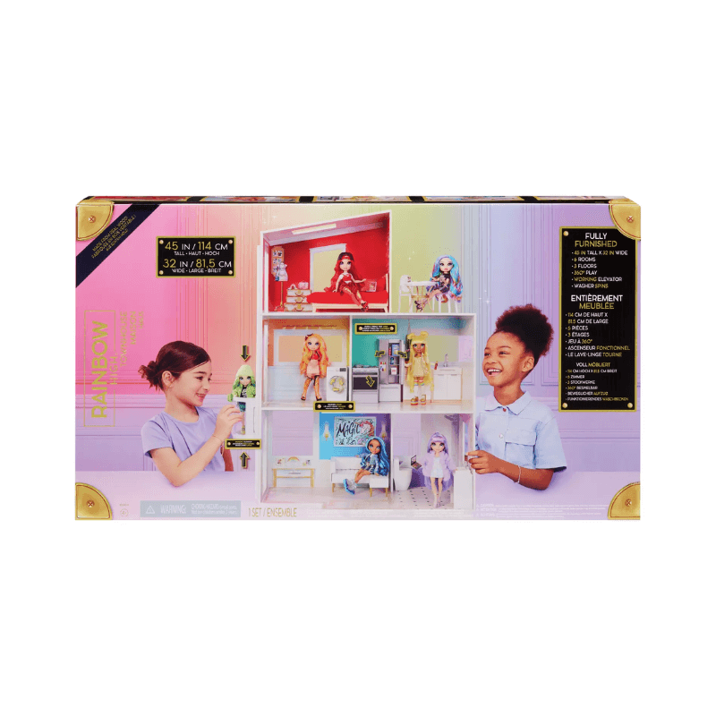 Experience limitless creativity with the Rainbow High Townhouse, a 3-Story Wood Doll House Playset. This fully furnished, colourful modern house is ideal for your Rainbow High fashion dolls to call home and bring their wildest dreams to life. Its sleek design and customisable play space allows for endless storytelling possibilities, as you arrange furniture and accessories in the 6 unique rooms.